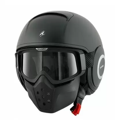 Casco Shark Helmets modello Drak versione monocolore nero opaco. Questo casco incarna uno stile tutto suo, estremamente aggressivo ed allo stesso tempo unico, proprio per la presenza della mascherina con mentoniera integrata. La calotta è realizzata in policarbonato ed integra una grande presa aria superiore che trae ispirazione dal mondo aeronautico. Gli occhiali sono fissati al casco per mezzo di elastici laterali e possono comunque essere sganciati. In alternativa potrete portare la mascherina nella parte superiore della calotta in quanto gli elastici di fissaggio possono scorrere all'interno del loro alloggiamento. La parte davanti al mento è anch'essa amovibile in modo da adattare il look del casco alle vostre preferenze permettendovi di utilizzarlo anche solo con gli occhiali. Gli interni sono in fibre naturali e completamente amovibili per il lavaggio. Sarà possibile indossare il casco anche con occhiali da vista grazie al sistema Sharl Easy Fit.