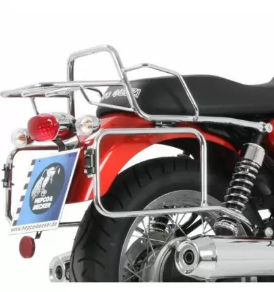 Telai laterali cromati Hepco & Becker neri specifici per Moto Guzzi V7 Cafe Classic 2009-2011, V7 Classic 2008-2011 e V7 Special dal 2012. Grazie a questi telai laterali potrete sostenere qualsiasi modello di borse latelali morbide senza che le stesse vadano a toccare parti in movimento. Ogni telaio si adatta perfettamente alla moto sfruttando attacchi pre esistenti. Vanno applicati necessariamente in coppia e sono dotati di istruzioni di montaggio e di tutti gli accessori per effettuare una corretta installazione.