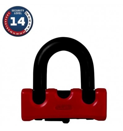 Bloccadisco o bloccacorona Abus modello Granit XS, colore rosso. Questo antifurto è stato sviluppato per offrire varie alternative in quanto potrà essere utilizzato come bloccadisco, come bloccacorona o addirittura come lucchetto per una catena (in tutti questi casi è opportuno verificare che ci siano fori o spazi adatti all'applicazione). E' interamente realizzato in speciale acciaio cementato con una sezione di arco da 14mm in modo da renderlo veramente inattaccabile. La serratura è di tipo Abus X-Plus per offrire un ulteriore garanzia di sicurezza rispetto a qualsiasi prodotto concorrente.