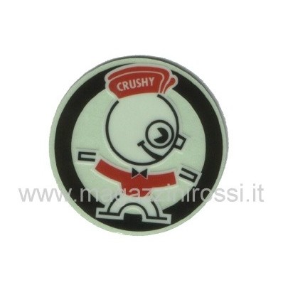 Adesivo di importazione tondo con pupazzetto Crushy. Realizzati con la massima cura e in materiale resistente sono adatti anche per essere attaccati su carrozzerie di auto e moto esposte agli agenti atmosferici.