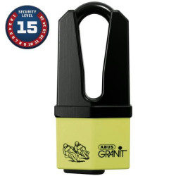 Bloccadisco a lucchetto Abus modello Granit Quick 37, colore giallo. Questo modello rappresenta uno dei bloccadisco più copiati dalla concorrenza e rimane uno dei prodotti Abus più venduti di sempre. Il Quick 37 è stato uno dei primi bloccadisco a cambiare forma allontanandosi dal classico sistema con perno a favore di una tipologia a lucchetto. Oltre ad essere realizzato in lega di acciaio speciale cementato e indurito, offre il doppio bloccaggio dell'arco a sfere e la serratura Abus Granit.