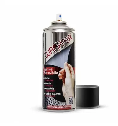 Bomboletta di vernice spray Wrapper da 400 ml colore nero opaco RAL 9005. Finalmente il wrapping è alla portata di tutti. Grazie a Wrapper spray potrete verniciare una superficie o anche solo dei particolari creando una pellicola facilmente rimovibile. La speciale vernice che compone la Wrapper crea infatti un involucro sull'oggetto senza aggredirlo intaccandone la superficie e vi sarà quindi possibile rimuoverla molto facilmente, come se si trattasse di un adesivo molto elastico. Anche applicarla sarà più semplice grazie alla sua particolare formulazione.
