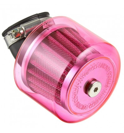 Filtro aria di potenza Kitaco inclinato di 45 gradi con copertura trasparente rosa. Questo filtro ha diametro 35mm (si adatta quindi a quasi tutti i carburatori originali di scooter 50cc e ai 19 e 21mm) e la sua copertura in plastica lo protegge da pioggia, terra o fango rendendo più stabile la carburazione.
