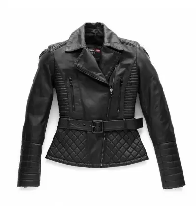 Giacca da moto da donna Blauer H.T. in pelle modello Trinity da donna, colore nero. Questa giacca da moto Blauer è stata disegnata per il pubblico femminile e presenta un look aggressivo stile chiodo a metà strada tra il classico ed il moderno. In alcuni punti la pelle è stata lavorata con degli inserti trapuntati e imbottiti, che unitamente alle zip a contrasto ed alla cinta in vita, enfatizzano l'aspetto vintage. Le protezioni sulle spalle sono incorporate alla struttura della giacca che esternamente propone il caratteristico logo Blauer mentre sui gomiti è presente la predisposizione di dimensioni standard.