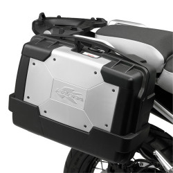 Valigia rigida Kappa attacco Monokey modello KGR33 Garda, nera da 33 litri con finitura in alluminio. Questa valigia in versione da 33 litri potrà essere utilizzata lateralmente o come baule posteriore. Le nuove GARDA sono la soluzione ideale per le moto dotate di terminale di scarico solo su un lato; montando infatti la valigia più piccola sul lato dove è presente la marmitta e la grande dall'altro lato, in molti casi si risolve il problema dell'asimmetria che si otterrebbe con delle tradizionali valigie laterali. Impreziosite da una pregiata lamina in vero alluminio anodizzato, tali valigie sono particolarmente indicate non solo per le enduro stradali, ma anche per le più eleganti moto turistiche. La particolarità di essere vendute in confezione singola, e di essere utilizzate come bauletto top case sulle piastre Monokey, permette al cliente di scegliere la combinazione che più riesce a soddisfare le sue esigenze di spazio, decidendo quali versioni montare sulla propria moto.