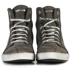 Sneakers da moto Stylmartin modello Marshall, colore marrone vintage. Come con tutti i suoi prodotti la Stylmartin ha prodotto queste scarpe, rigorosamente made in Italy, con la massima cura e con materiali di primissima qualità. Realizzate interamente in pelle pieno fiore effetto vintage oliata e trattata water repellent, racchiudono doti tecniche di primo livello a cominciare dalla membrana interna totalmente impermeabile all'acqua e traspirante. Sono infatti presenti delle protezioni sui malleoli interne in PU e in gomma WR all'esterno con alto potere di assorbimento urti. Un inserto aggiuntivo protegge le scarpe dalla leva cambio e, per finire, la nuova suola è in gomma con grip antiscivolo. La chiusura con lacci, il look sobrio e l'effetto vintage rendono queste scarpe estremamente adatte anche all'uso quotidiano.