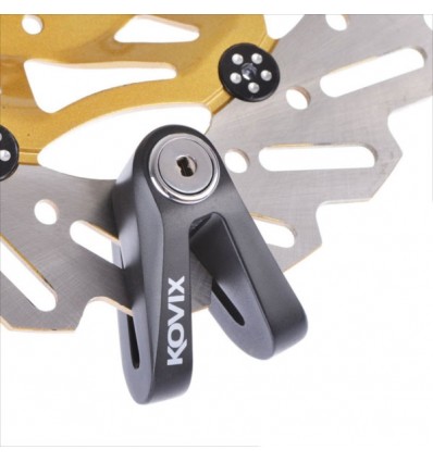 Bloccadisco Kovix modello KV-1 versione con perno da 5mm, colore nero. Questo bloccadisco ha una struttura differente rispetto a quelli tradizionali grazie alla struttura sdoppiata che offre quindi due punti separati da dover forzare. I bloccadisco con perno piccolo e struttura tradizionale sono quindi molto più delicati di del Kovix KV1 che rappresenta quindi una buona scelta nell'ambito dei prodotti economici. Viene proposto anche in altre colorazioni.