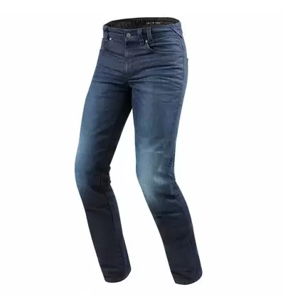Jeans da moto e scooter Revit modello Vendome 2 RF, versione con gamba più corta (L32) colore blu scuro slavato. I jeans Revit sono costituiti da uno speciale abbinamento di filati tra cotone Denim, Cordura e Coolmax. L'aspetto estetico è quello di un jeans alla moda ma avrete invece una maggiore resistenza all'abrasione ed una resa termica migliore, soprattutto in caso di sudore in quanto il Coolmax provvede alla sua eliminazione verso lo strato esterno. Il tutto è leggermente elasticizzato per migliorare il comfort. Anche le cuciture sono rinforzate con materiali tecnici e la loro disposizione è stata pensata per stare in sella senza dare fastidio. Sulle ginocchia sono presenti le protezioni Revit Knox Lite CE amovibili e alloggiate in tasche con regolazione dell'altezza per una perfetta disposizione.