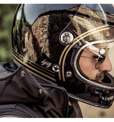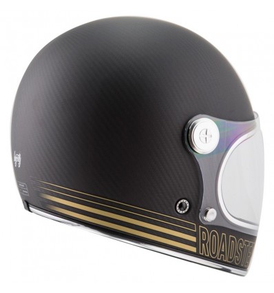 Casco integrale Vintage By City modello Roadster Carbon, in fibra di carbonio opaca con dettagli oro. Questo casco della spagnola By City è un prodotto davvero interessante per il design, dichiaratamente ispirato agli anni '60-'70, e per il rapporto qualità prezzo. La calotta del Roadster è realizzata in pura fibra di carbonio, dalle misure esterne compatte, e molto leggero in quanto pesa circa 1100 grammi. Gli interni, oltre ad essere completamente amovibili per il lavaggio, sono molto curati e di un elegante colore beige in similpelle e tessuto dall'effetto scamosciato. La visiera, che potrete chiaramente sollevare, ha anch'essa un connotato retrò facilmente identificabile negli automatici inferiori per la chiusura ed è fissata al casco con delle viti in alluminio tonde e caratteristiche. Sulla mentoniera è stata inserita una presa aria che potrete aprire e chiudere. Cinturino con chiusura a doppio anello.