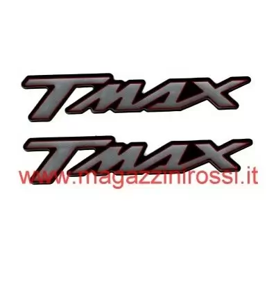 Set composto di due adesivi resinati con scritta T-Max misura 14,5 cm, realizzati in unica colorazione argento con bordo rosso e nero. Ogni adesivo è realizzato in resina 3D (in rilievo) e si può attaccare senza problemi su plastica o metallo.