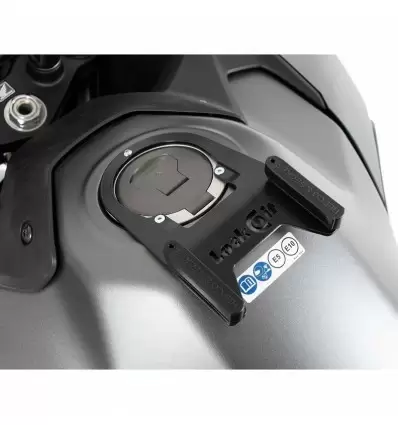 Il sistema Tank Ring prevede il montaggio di questa flangia sulla cornice del tappo serbatoio che permetterà poi il collegamento rapido e sicuro di una serie di borse serbatoio predisposte. La flangia non impedisce l'aperture del tappo del serbatoio e il sistema di ancoraggio, coadiuvato da magneti per un perfetto centramento, con le borse è rapido da gestire e anche molto sicuro.