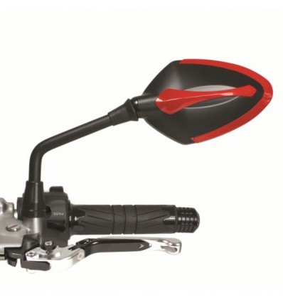 Specchio Chaft modello Story per montaggio su manubrio, colore nero e rosso. Questo specchietto nasce per essere applicato sui fori del manubrio moto con passo standard da 10mm. La calotta dello specchio, realizzata in ABS, è montata su biglia e vi permetterà una facile regolazione. Grazie alla gamma colori potrete gestire al meglio una personalizzazione in abbinamento alla livrea della moto.