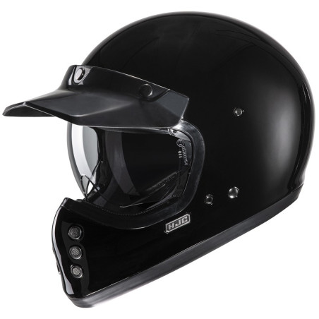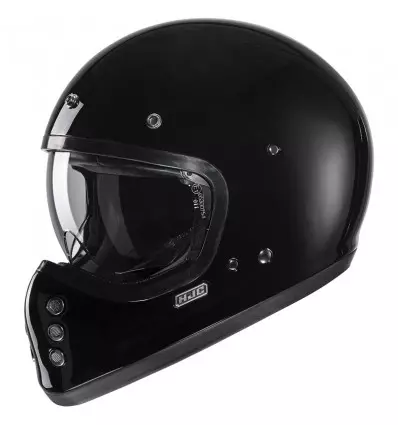 Casco HJC modello V60 versione UNI nero lucido. La HJC propone nella sua nuova gamma un casco integrale espressamente dedicato alle moto classiche, bobber, custom e cafè racer. L'ispirazione ai caschi enduro anni '80 lo rende un must per alcune moto odierne. Il V60 ha la calotta realizzata in fibra di vetro in diverse misure esterne per una migliore proporzione in ogni taglia. Nonostante questo casco abbia una una linea particolare e aperta è stato comunque ottimizzato per offrire il massimo comfort possibile. La visiera è di tipo a scomparsa che è stata disegnata per deviare quanto più possibile l'aria dagli occhi ed è dotata di una regolazione in tre posizioni. Gli interni sono curati, in materiale supercool, amovibili per il lavaggio e dotati del sistema di estrazione dei guanciotti in caso di emergenza. Sulla calotta sono applicati i tre bottoni per l'applicazione del frontino nero, incluso nella confezione.