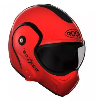 Casco Roof modello R09 Boxxer UNI, versione monocolore rosso lucido. I caschi Roof della famiglia Boxer si riconoscono anche da lontano in quanto iconici e davvero unici in termini stilistici, di dichiarata derivazione aeronautica. Il nuovo modello R09 Boxxer si migliora in particolar modo nel meccanismo della mentoniera, adesso più preciso ed efficiente. La calotta è realizzata in fibra di vetro ma il suo punto forte è la mentoniera ribaltabile a 180 gradi in maniera indipendente dalla visiera, di tipo sagomato sul naso, per trasformare il casco da integrale a jet. La visiera, dalla curvatura bombata e sinuosa, è anche trattata antigraffio e anti appannante e potrà essere alzata e abbassata indipendentemente dalla posizione della mentoniera. Il casco è dotato di varie prese aria per la ventilazione e di interni in tessuti morbidi e confortevoli, completamente staccabili per il lavaggio. Cinturino con chiusura a sgancio rapido.