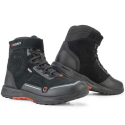 Sneakers da moto Eleveit modello Nirvana Waterproof in pelle nera. Le Nirvana rappresentano la fusione tra una scarpa tecnica e una sneaker e sarà perfetta per essere indossata tutti i giorni. Le Eleveit Nirvana WP sono realizzate in pelle scamosciata con l'aggiunta della membrana interna E-Dry che le rende completamente impermeabili all'acqua. Anche l'aspetto protettivo è stato curato nei dettagli e confermato dalla certificazione CE ottenuta nei vari test di resistenza all'abrasione. Punta e tacco sono rinforzate mentre in corrispondenza del malleoli è inserita una ulteriore protezione termoformata. Queste scarpe hanno una calzata comunque comoda e sono dotate di plantare amovibile.