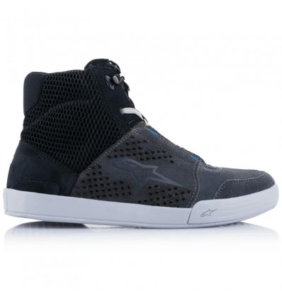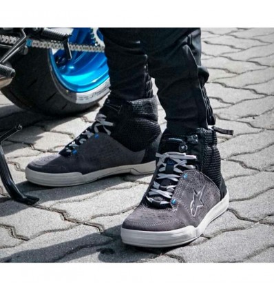 Sneakers da moto Alpinestars modello Chrome Air Shoe, colore nero e grigio con dettagli in blu. Le Chrome sono un incrocio tra una sneaker e una scarpa tecnica che comunque rimane utilizzabile anche nella vita di tutti i giorni come capo casual. Sono sono realizzate in pelle scamosciata traforata con ampi inserti in tessuto mesh per massimizzare la ventilazione. Grazie ai vari rinforzi avrete la protezione necessaria in moto, certificata dalla omologazione CE ottenuta nei vari test di resistenza all'abrasione, al taglio da impatto e alla rigidità della suola. La zona intorno ai malleoli è particolarmente imbottita per offrire maggiore sicurezza in caso di urti. Queste scarpe hanno una calzata comunque comoda e sono dotate di plantare amovibile.
