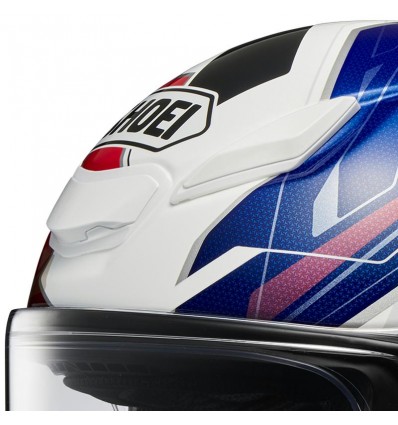 Casco Shoei modello NXR 2 grafica Capriccio TC10, bianco, blu e rosso lucidi. La Shoei rinnova il suo più popolare casco integrale per uso sportivo alla versione NXR 2. Come tutti i prodotti Shoei, anche questo casco è realizzato con la ormai nota fibra Shoei AIM+, che raggruppa vari strati di fibre di vetro, Kevlar ed organiche e viene presentato in quattro diverse dimensioni di calotta per coprire tutte le taglie proposte. Il modello NXR 2 ha beneficiato di tutti gli ultimi ritrovati in termini aerodinamici per massimizzare il comfort anche alle alte velocità unitamente alla ventilazione interna, incredibilmente migliorata rispetto al modello precedente, ben 6 prese aria frontali e 4 estrattori posteriori. La visiera CWR-F2 di tipo ampio ha il sistema autoregolante e basculante, proprio per assicurare sempre una perfetta aderenza alle guarnizioni in ogni condizione. La calotta interna è realizzata in uno speciale espanso EPS a densità multiple mentre gli interni veri e propri, in tessuto speciale 3D Max Dry, sono amovibili per il lavaggio. La chiusura è di tipo a doppia D e, per aumentare la sicurezza, è presente anche il sistema di rimozione rapida dei guanciali in caso di incidente. Fornito di serie anche il visierino antiappannante applicabile con facilità sui pin-lock della visiera. Garanzia 5 anni dall'acquisto: la più lunga sul mercato.