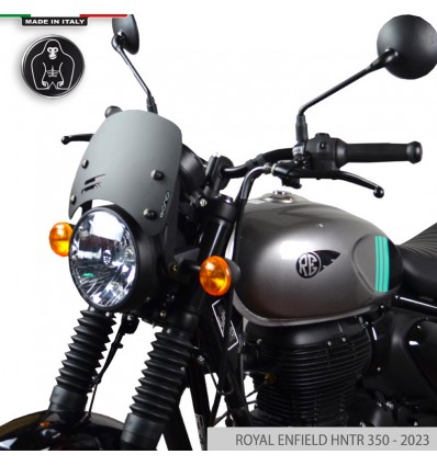 Cupolino Biondi modello Sport per Royal Enfield HNTR 350, colore fumè scuro. Il cupolino Biondi Sport è realizzato in resistente AVS spesso 3mm e nasce in maniera specifica per questa moto. Lo stile elegante e minimale lo rende adatto a completare il look dell'avantreno offrendo anche un minimo di protezione dal flusso d'aria. Viene fornito di attacchi dedicati ed istruzioni di montaggio.