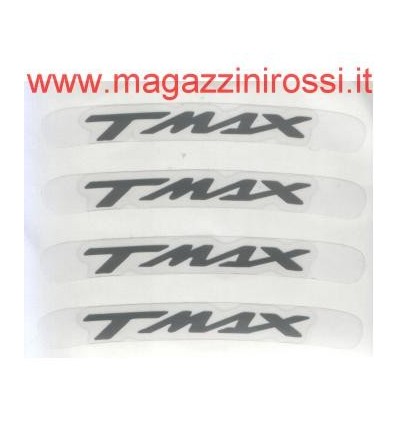 Set di 4 adesivi con scritta TMAX adesiva lunghezza cm 8, colore argento. Ideali per applicazioni su cerchi. Applicarlo è veramente semplice grazie alla doppia pellicola e la sua resistenza all'usura rimane inalterata per anni.