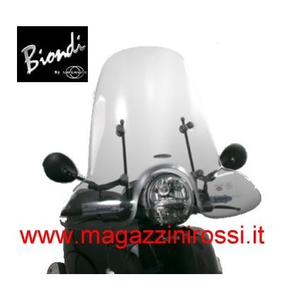 Parabrezza Biondi, modello Club completo di attacchi specifici per Piaggio Vespa GTS 300. Questo modello di parabrezza ha lo schermo senza bordino in gomma, la parte inferiorte è serigrafata per avere un effetto antiriflesso. Gli attacchi sono forniti di tutte le viti ed i bulloni per un facile montaggio. Il plexiglass di cui è costituito è ad alta trasparenza e di ottima qualità.