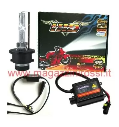 Kit completo di conversione per la singola lampada HID allo Xeno H7. Questo set è composto da una lampadina H7 da 6000K Super White specifico per moto e scooter che montano questo tipo di lampada. Sono presenti anche trasformatore, centralina (di tipo slim, estrememente sottile per facilitarne l\'alloggiamento) e quanto necessario per il montaggio. L\'effetto del fascio di luce, oltre a migliorare enormemente la visibilità, sarà di un bianco puro e la durata della lampada sarà aumentata di quasi dieci volte con un grande risparmio di energia.