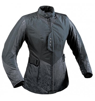 Giacca da moto Ixon da donna modello Jasmin, colore nero. Questo giacca da taglio lungo, realizzato espressamente dalla Ixon per il pubblico femminile, è come sempre ben curato nei dettagli. E' realizzata in resistente polyestere ed è totalmente impermeabile all'acqua, adatto sia per l'inverno che per le stagioni più miti grazie alla termofodera invernale removibile all'occorrenza. Potrete trovare delle stelline applicate sulle chiusure mentre, nella parte frontale bassa e sulle maniche, sono presenti delle piccole decorazioni tono su tono per addolcirne l'aspetto. Non mancano le protezioni olologate e amovibili su spalle e gomiti ed un inserto in schiuma antishock sulla schiena. Regolazioni del polsino e del collo con strech.